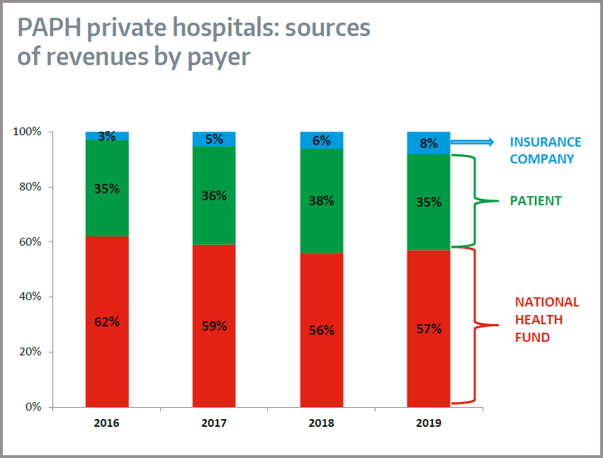 The activity of PAPH private hospitals is financed from public funds at the disposal of the National Health Fund (NFZ). In 2019 the National Health Fund financed PAPH private hospitals at average level of 57%. The share of financing of benefits by insurers is increasing, which is the direction expected in health care.